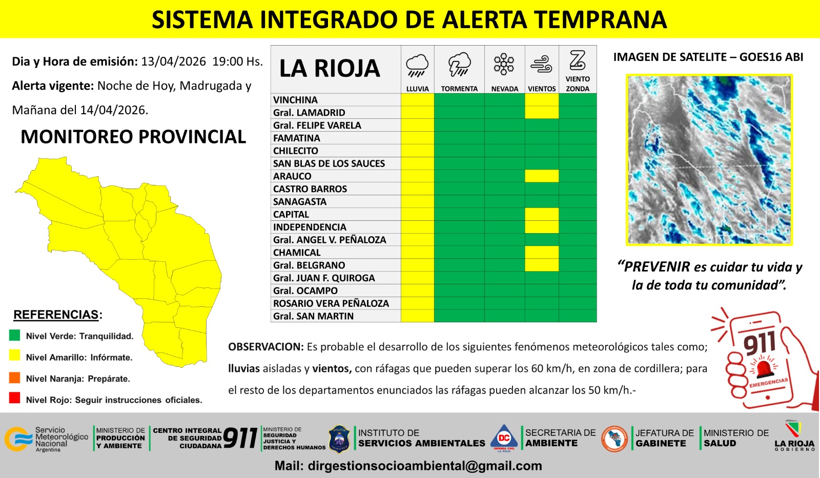 De acuerdo al informe, es probable el desarrollo de lluvias aisladas en toda la provincia de La Rioja. En tanto, la advertencia por vientos con ráfagas que pueden superar los 60 kilómetros por hora es para los departamentos Vinchina, General Lamadrid, Arauco, Capital, Independencia, Chamical y General Belgrano.