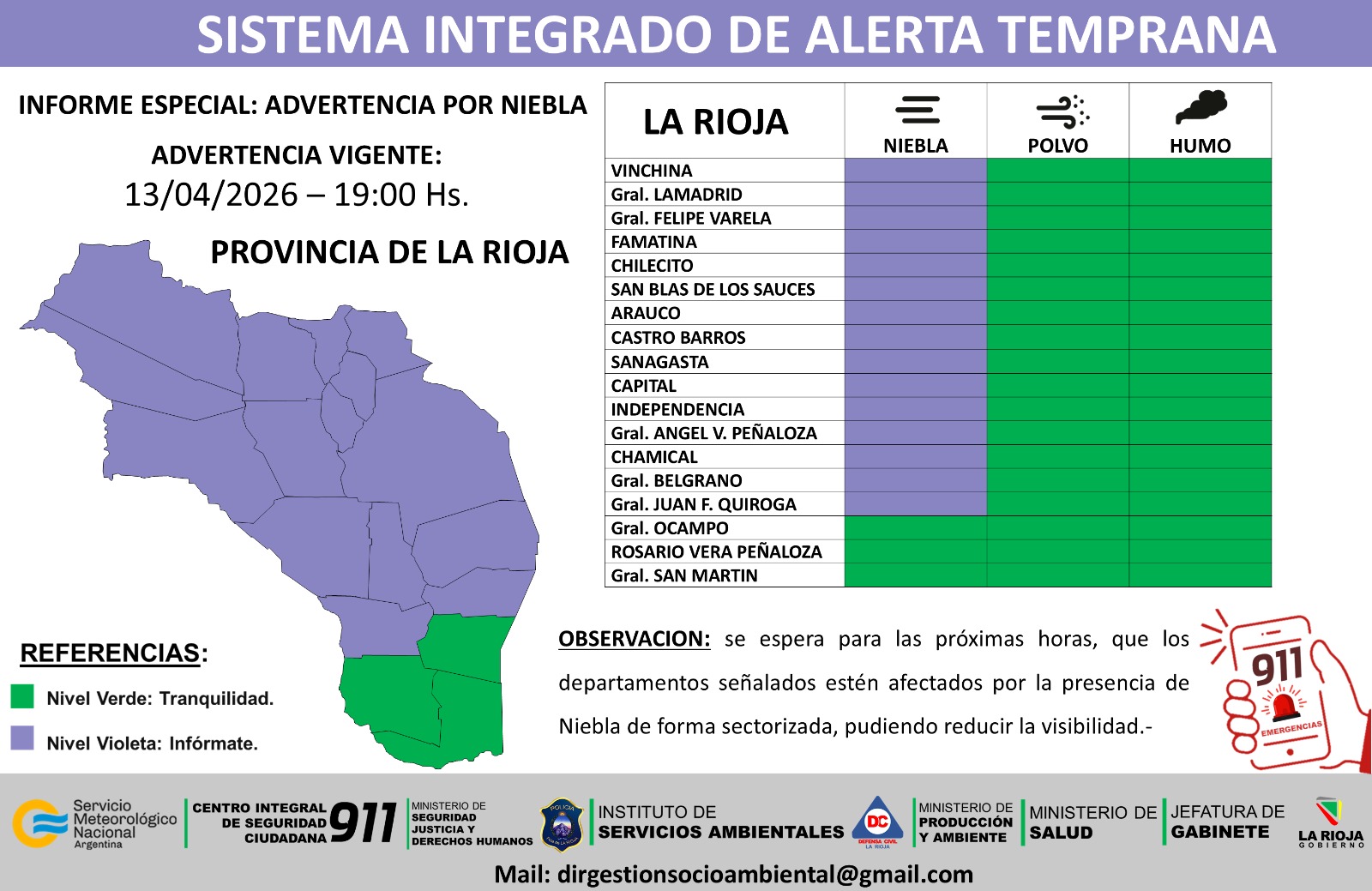 De la misma manera, el reporte indica que se espera para las próximas horas la presencia de niebla que puede reducir la visibilidad en los departamentos Vinchina, General Lamadrid, General Felipe Varela, Famatina, Chilecito, San Blas de los Sauces, Arauco, Castro Barros, Sanagasta, Capital, Independencia, General Ángel Vicente Peñaloza, Chamical, General Belgrano y General Juan F. Quiroga.