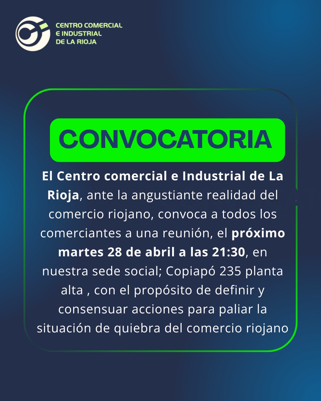 Finalmente, Keulian convocó a comerciantes a participar de una reunión este martes a las 21:30 en la sede del Centro Comercial, ubicada en Copiapó 235, planta alta. El objetivo será intercambiar ideas, recibir propuestas y avanzar en gestiones locales, como posibles moratorias provinciales y municipales para el sector.