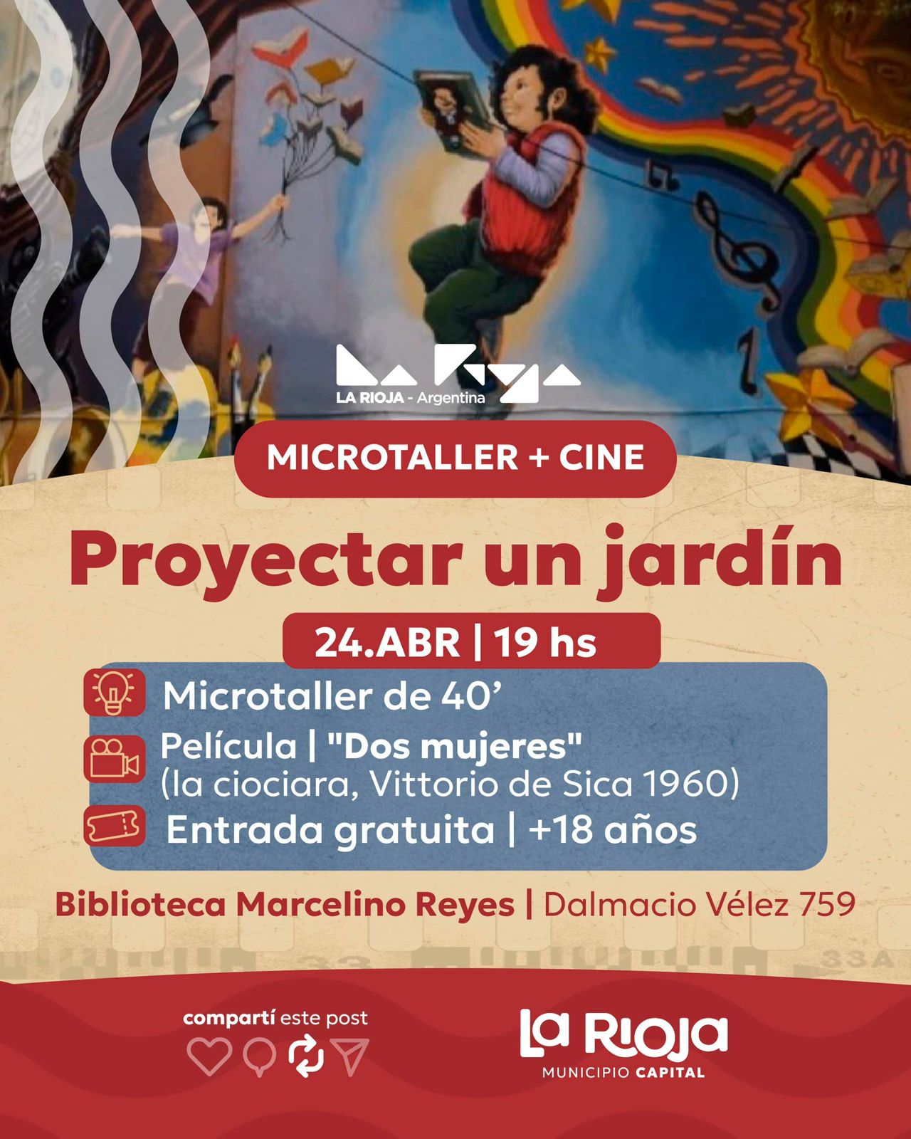La Dirección de Letras del municipio y la histórica institución riojana ofrecen una jornada gratuita que combina formación literaria y cine para mayores de 13 años.